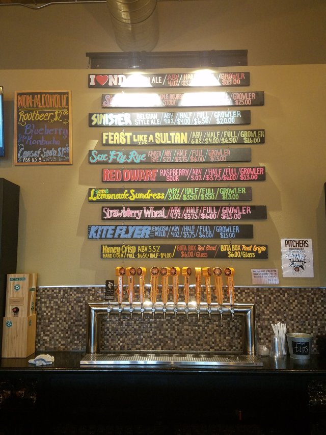 Laughing Sun had been recommended by a number of people as one of the best breweries in Bismarck. Unfortunately, their brewery is pretty far south in Bismarck and my AirBnB was on the north side, and I didn’t want to make the schlep. However, they recently opened a taproom in Mandan that also features a barbecue restaurant, and that was much more convenient to me. So I got to try a handful of their beers and had a delicious high-protein dinner. Maybe it’s just the weather, but I was really partial to flavored beers today. My favorite beer at Laughing Sun was the Red Dwarf, their raspberry sour (which is more tart like a raspberry than sour like a typical sour beer). My second favorite was the Lemonade Sundress, which is their lemonade radler. Radlers seem to be a big thing in Bismarck at the moment; I had one at every brewery I visited and really liked them all. [Ed. note: My esteemed father pointed me to this Wikipedia article, which notes that “radler” is German for “cyclist” and that radlers were originally created about a century ago to refresh cyclists with a drink that had lower alcohol than regular beer. So I guess it’s particularly appropriate that I’ve been drinking them!]