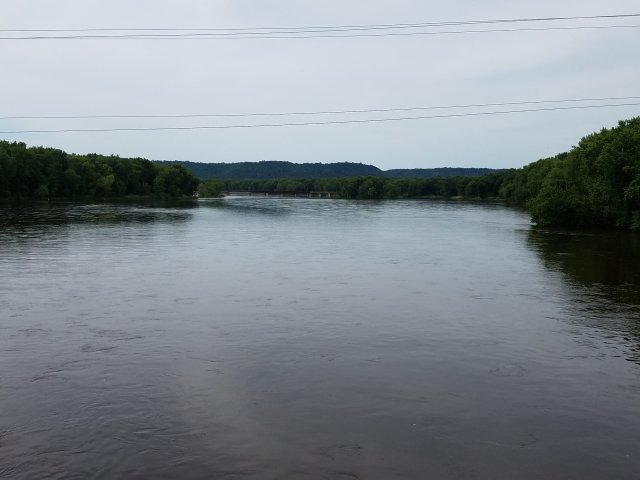 Given the storm-shortened ride yesterday, I knew I was in for a long ride today because I really wanted to make it as far as La Crosse. So turning over a new leaf, I dragged myself out of bed before 6, ate a couple of bowls of cereal at the hotel’s free breakfast, and managed to hit the road at 7:15. Baby steps. A short ride brought me into downtown Red Wing, and from there I got on the US-63 bridge to Wisconsin.