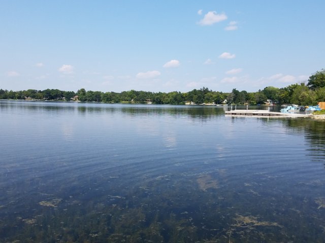A couple of miles after the grass incident, and 48 miles total into my day, I entered the city of Oconomowoc (accent on the second syllable). This was quite clearly a suburb of Milwaukee, and everything I’ve biked through since then has been continuous suburbs. Oconomowoc is a pretty nice-looking suburb though, and it has a couple of nice lakes in the city center. Lacking anything else to photograph today, I took a couple of pictures of Lake Fowler.