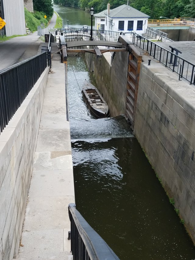 Actually, the giant lock is relatively new. Originally there were five small locks in sequence, known as the “Flight of Five”. In recent years those locks have been restored and left open just to show what the canal looked like originally.