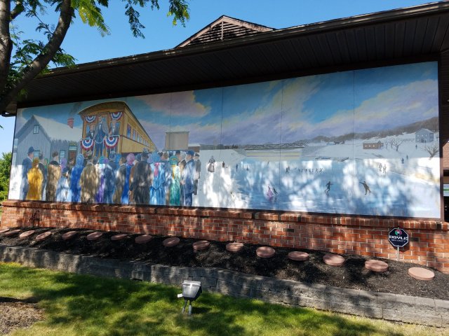 One thing of note in the mural: Today you can’t see the canal from the train tracks because there are bushes and trees in between, so it would be unrealistic to show a clear view from the train to the frozen canal. However, in the 19th century most land in the northeast was clear cut, so I can well believe there was a view from the tracks straight through to the canal. Why in the world did they think that chopping down every tree in sight was a good idea though?