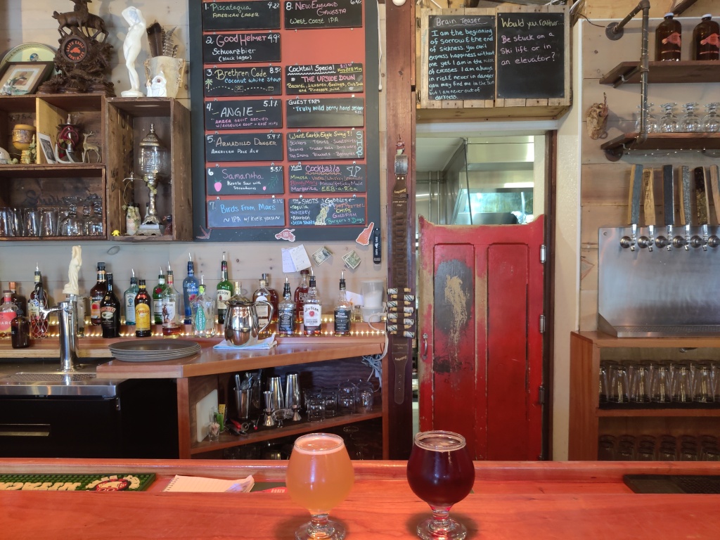 No visit to Portsmouth would be complete without a pilgrimage to Earth Eagle, so that was my next stop. Historically, Earth Eagle has specialized in gruits, which are a style of beer brewed without hops that instead use botanicals to impart bitterness. (Or sometimes they’ve even used bear meat and moose meat– I’m not making this up!) As they’ve expanded though, they’ve put more IPAs on the menu and now typically only carry one gruit at a time. That said, their Angie amber gruit with angelica root and rose hips was fantastic. The Birds from Mars kveik IPA was also solid. (Digression: When I was in Oslo last month I got a kveik saison at a brewery there. I wish American breweries would make something like that, but instead they only seem to use kveik yeast to make IPAs.)