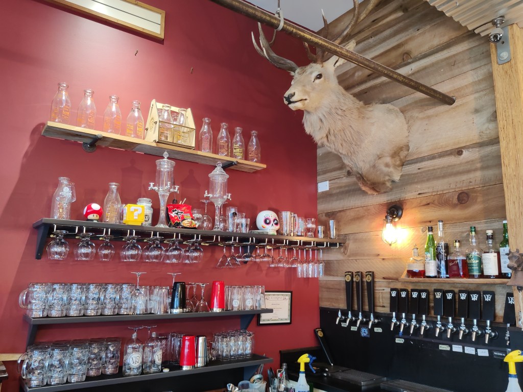 Having entered Kittery, I made a beeline for Woodland Farms. They have one of the best pilsners out there, but unfortunately they were out of it. (Doubly unfortunately, since they were also out of it the last time I was there!) However the owner remembered me from my last visit– and even remembered that we’d discussed Wordle the last time I was there– so he nicely gave me a sample of their “Cerveza Medico con Lima” Mexican lager with lime. Not quite as good as the pilsner but still really refreshing on a day like today. Lacking the pilsner, I decided to photograph their deer head instead.